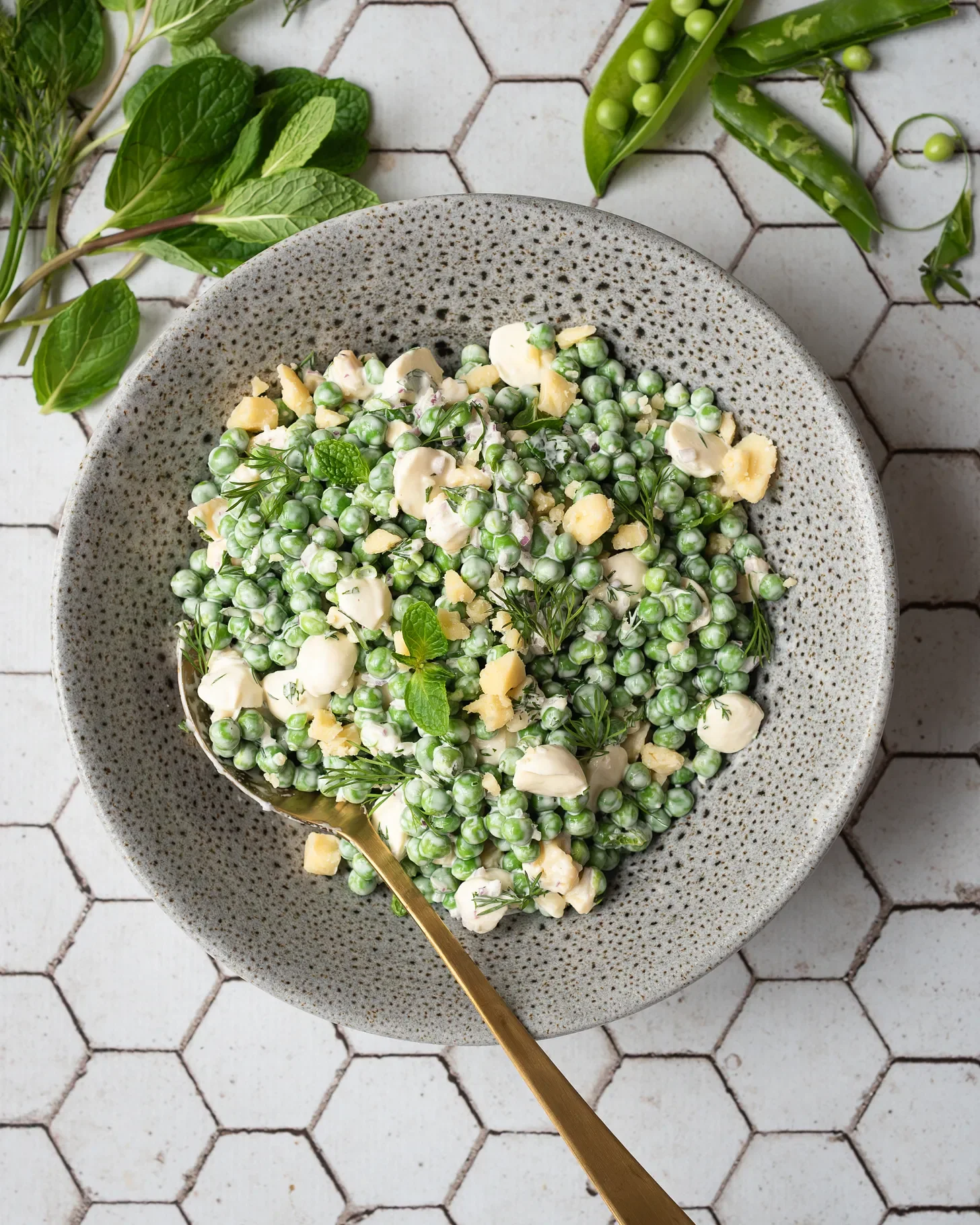 It felt odd to eat a salad in the depths of winter, as snow blew sideways across the windows and a fire warmed the house. Somewhat cautiously I served myself a scoop of salad and had a small taste. Bright fresh flavours floated on my palette, with little pops of sweetness from emerald, green baby peas, dotted with sharp savoury twangs of salad onion and the perfect foil of salty cheeses with a slight bite and chew all encased in a creamy dressing of mayo and sour cream. Every time I reminisce about this salad, I can almost vividly taste it in my memory. Obviously I went back for seconds and thirds, enjoying its vegetal lightness against the richness of the gravy gilded meat and warm roast vegetables.